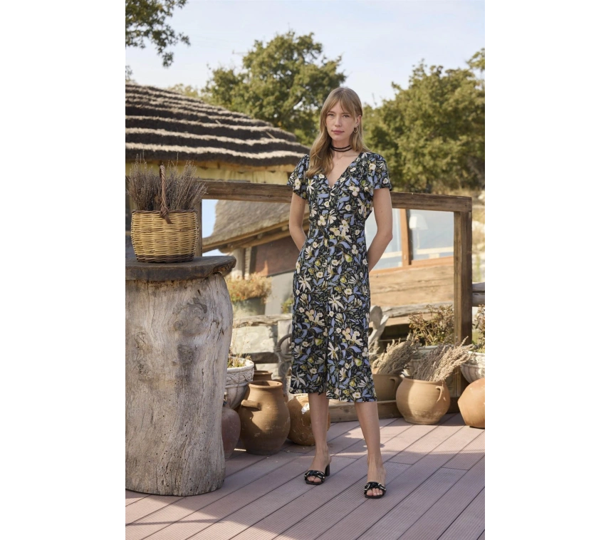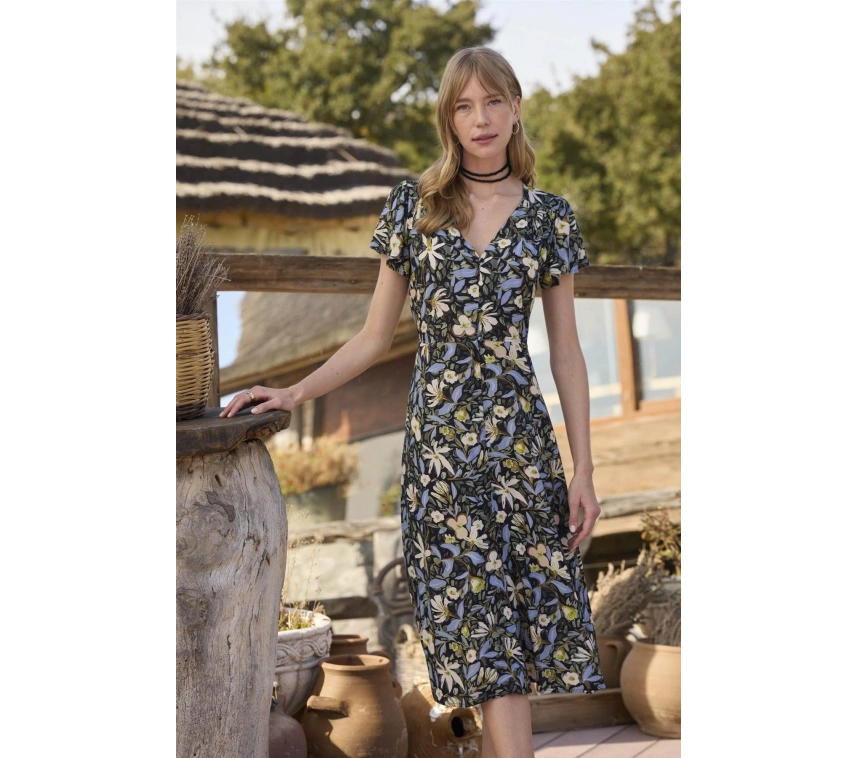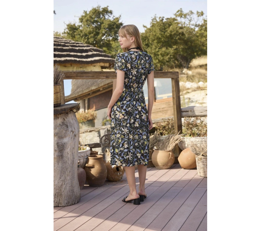 Elbise: Çiçek ve yaprak desenlidir, V yakalıdır, kısa kolludur, önü düğmelidir, dokuma kumaştır.