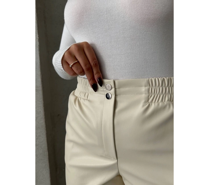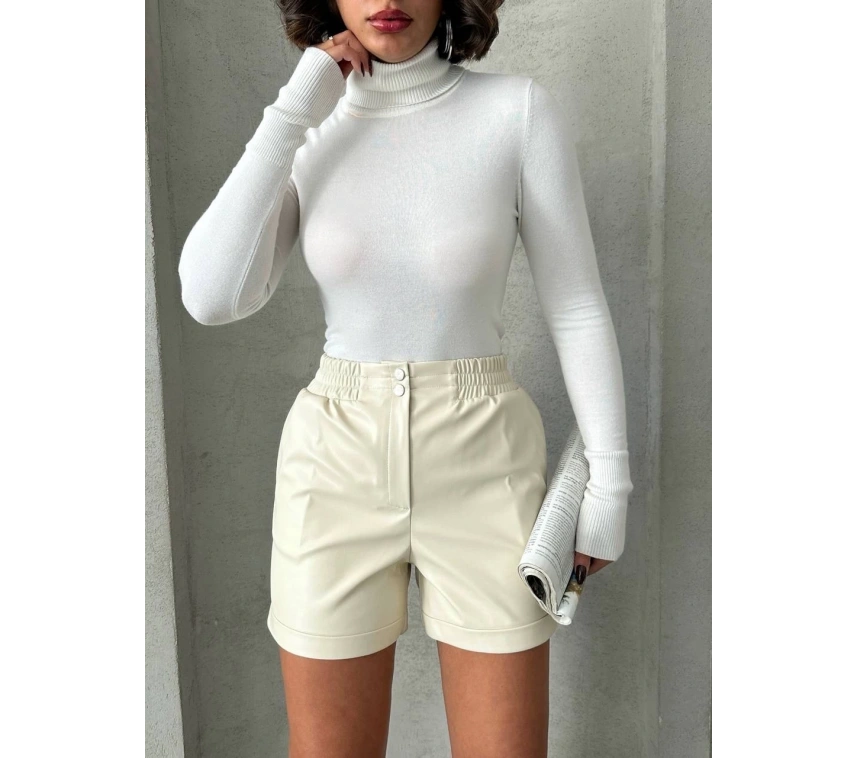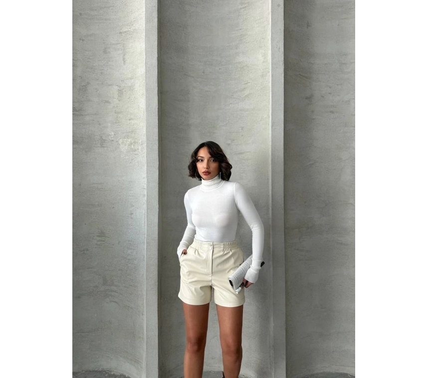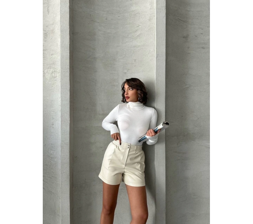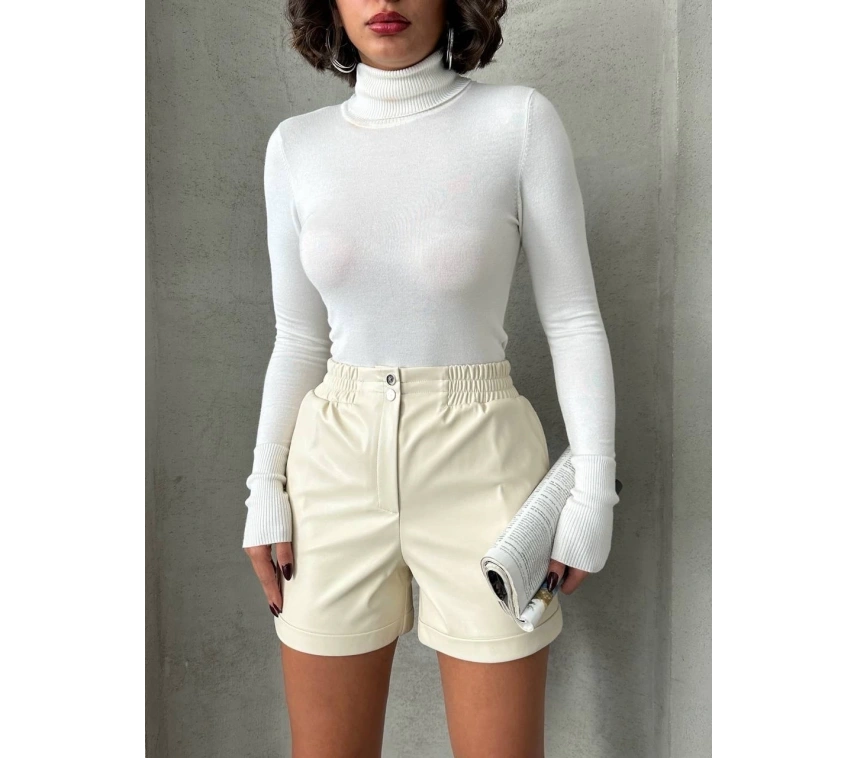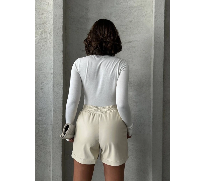 Şık ve modern tasarımıyla dikkat çeken Krem Beli Lastikli Çıtçıtlı Deri Şort, gardırobunuzun vazgeçilmezi olmaya aday!