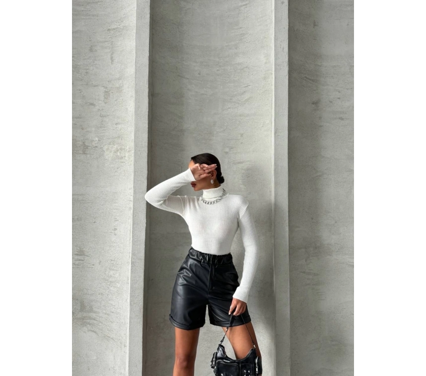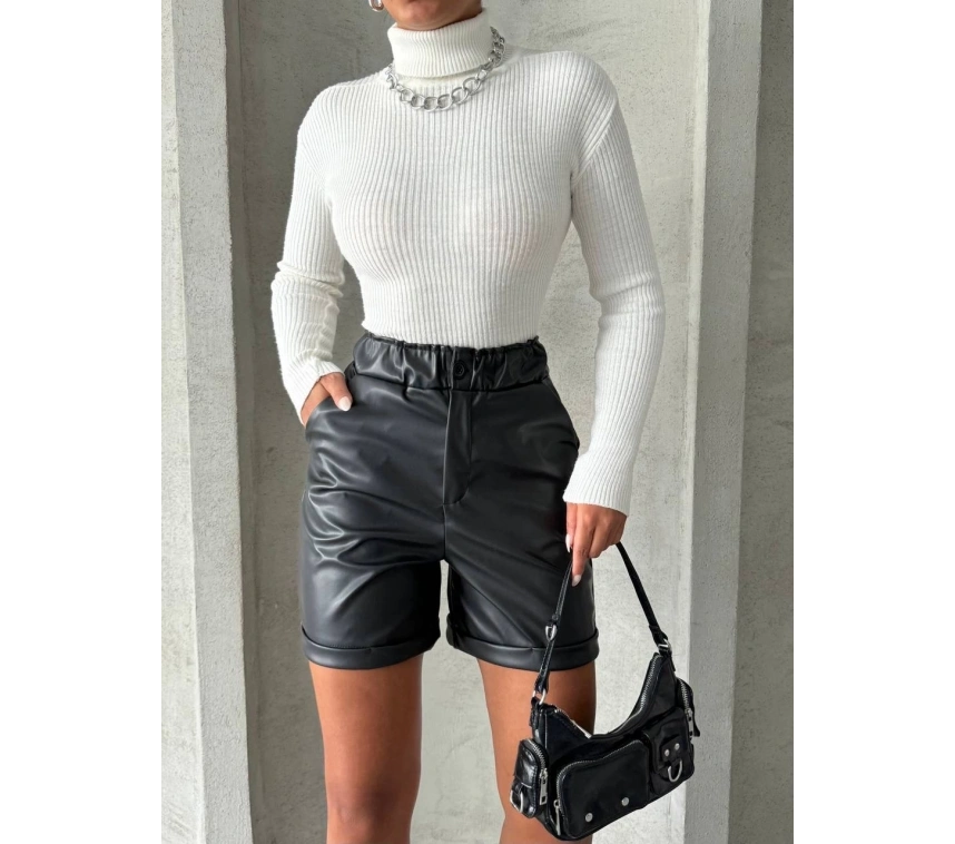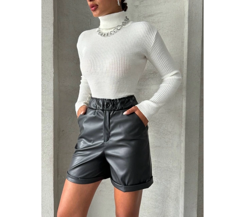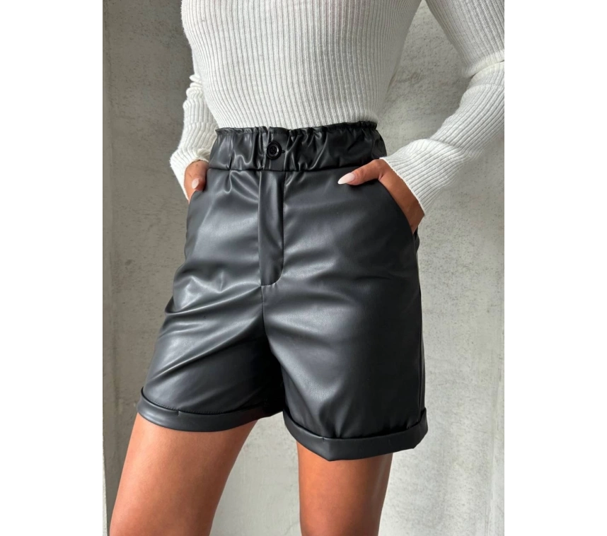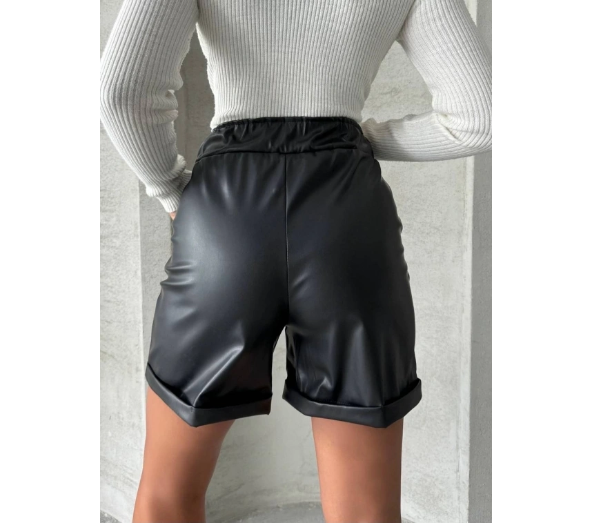 Şıklık ve rahatlık arayan kadınlar için ideal bir seçenek olan Beli Lastikli Duble Paça Deri Şort Siyah, gardırobunuzun vazgeçilmezi olmaya aday!