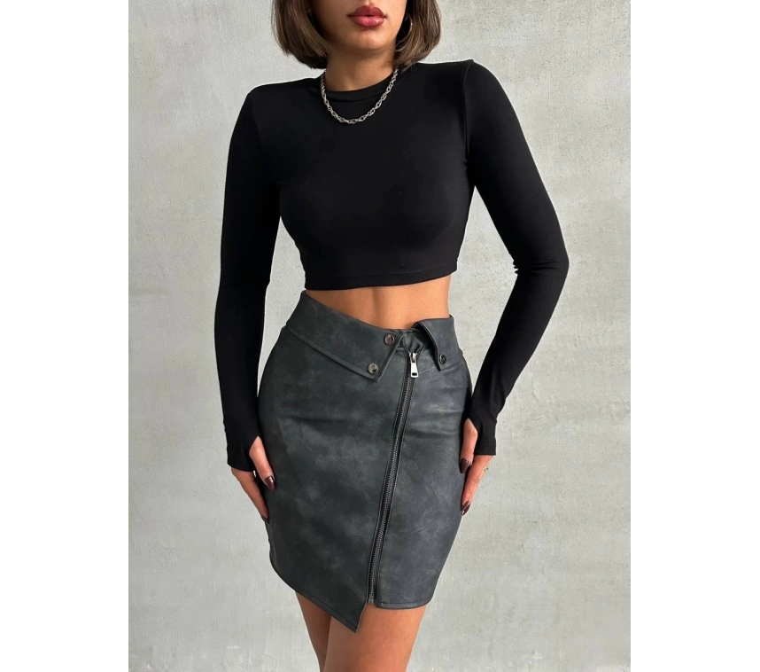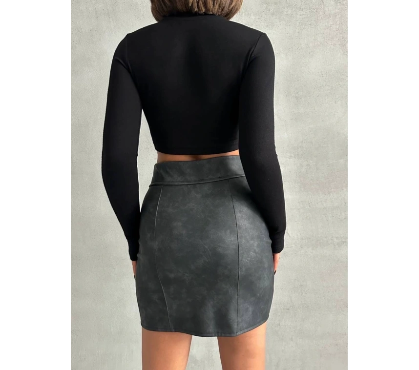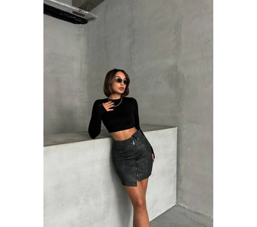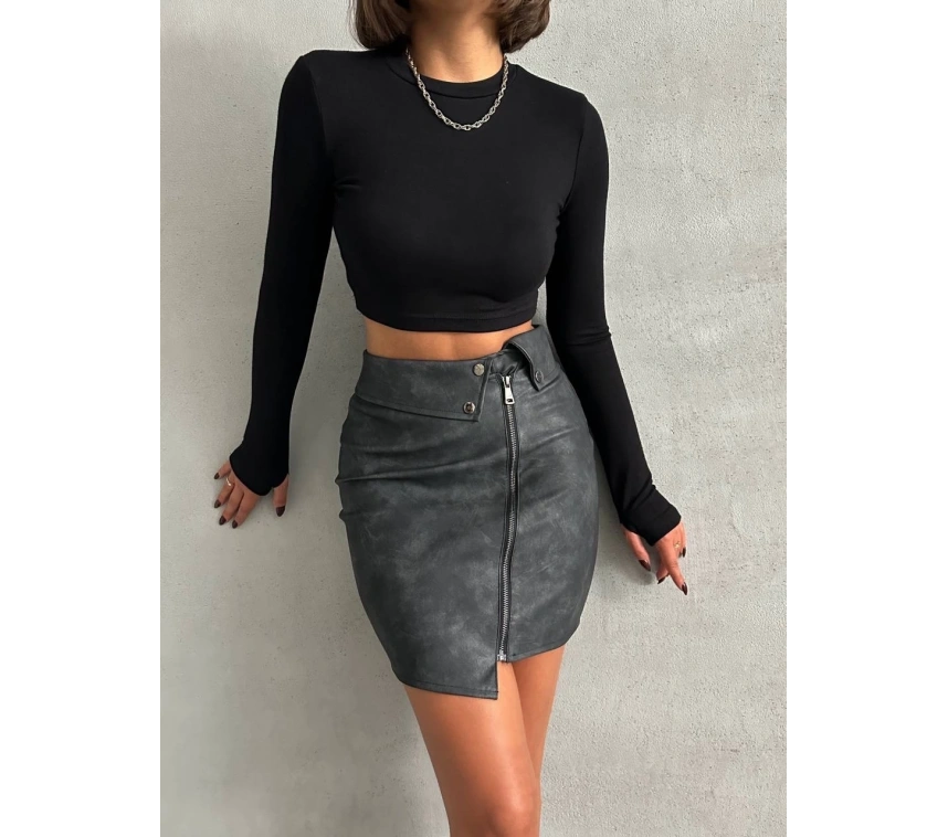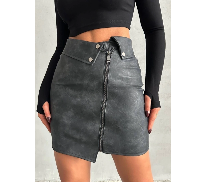 Beli pervazlı fermuarlı eskitme deri etek, şıklık ve tarz arayan kadınların favorisi olmaya aday bir parçadır.