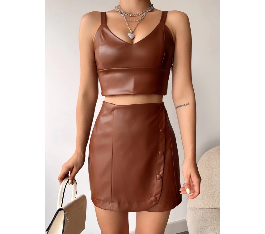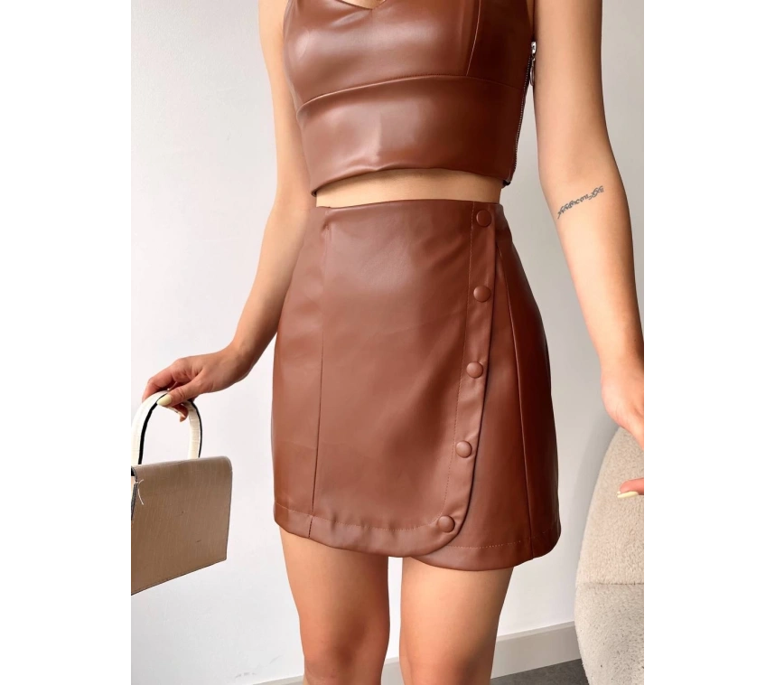 Günlük kullanımdan özel davetlere kadar birçok farklı kombinle rahatlıkla tamamlanabilen Beş düğmeli oval deri eteği, topuklu ayakkabılarla veya sneaker'larla kombinleyerek farklı tarzlara kolayca adapte edebilirsiniz.
