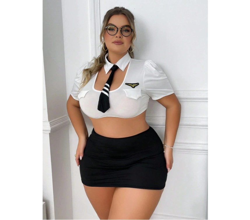 Büyük Beden Beyaz Bolerolu Mini Etekli Fantezi Havacı Kız Kostümü, cesur detayları ve etkileyici tasarımıyla dikkatleri üzerine çekmeye hazır.