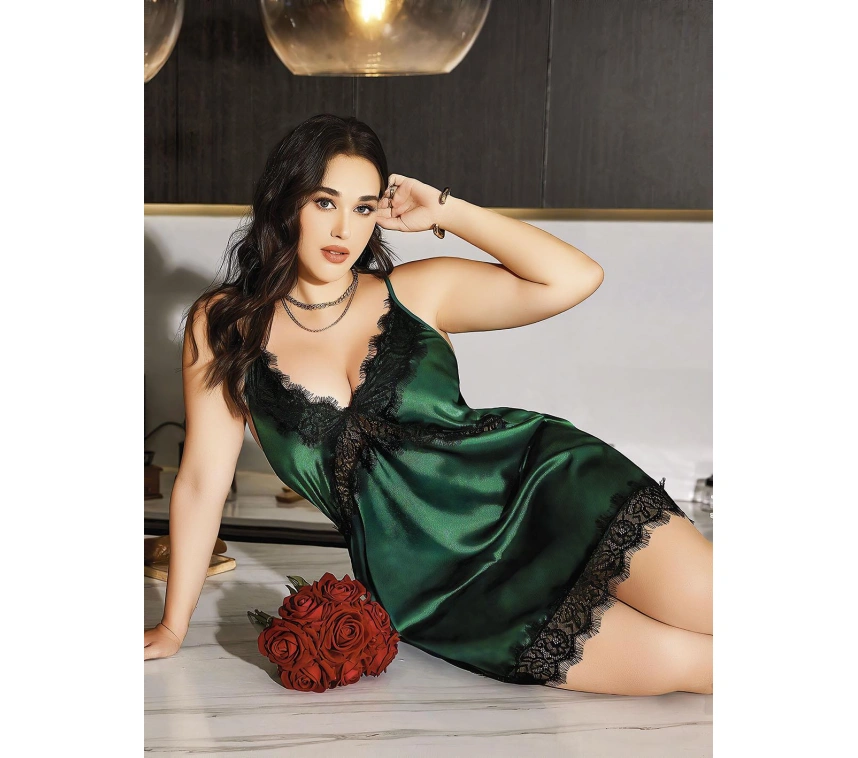Büyük Beden Yeşil Dantel İşlemeli İnce Askılı Saten Fantezi Gecelik, satenin zarif dokusu ve dantelin çekici detaylarıyla baş döndürücü bir uyum sunuyor.