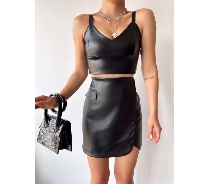 Şıklık ve zarafetin buluştuğu Cep Detaylı Oval Kapaklı Deri Etek Siyah, gardırobunuzun vazgeçilmezi olmaya aday!