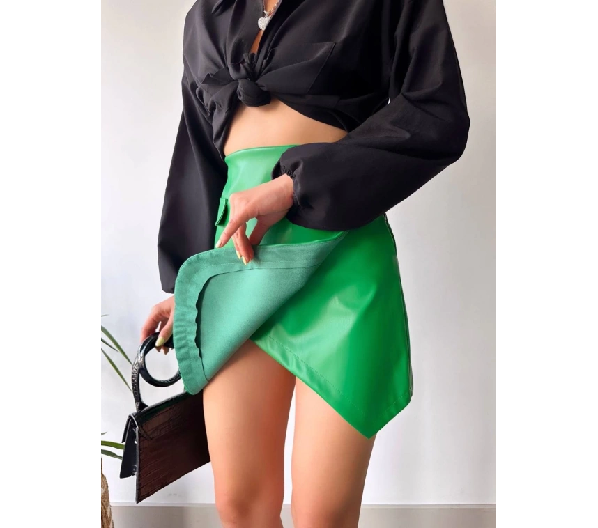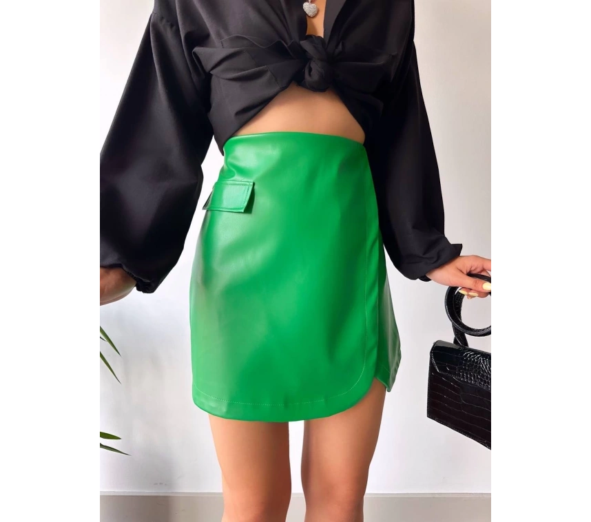 Şıklığı ve rahatlığı bir arada arayan kadınların tercihi olan Cep Detaylı Oval Kapaklı Deri Etek Yeşil, şıklığı seven kadınların gardırobunda mutlaka bulunmalı.