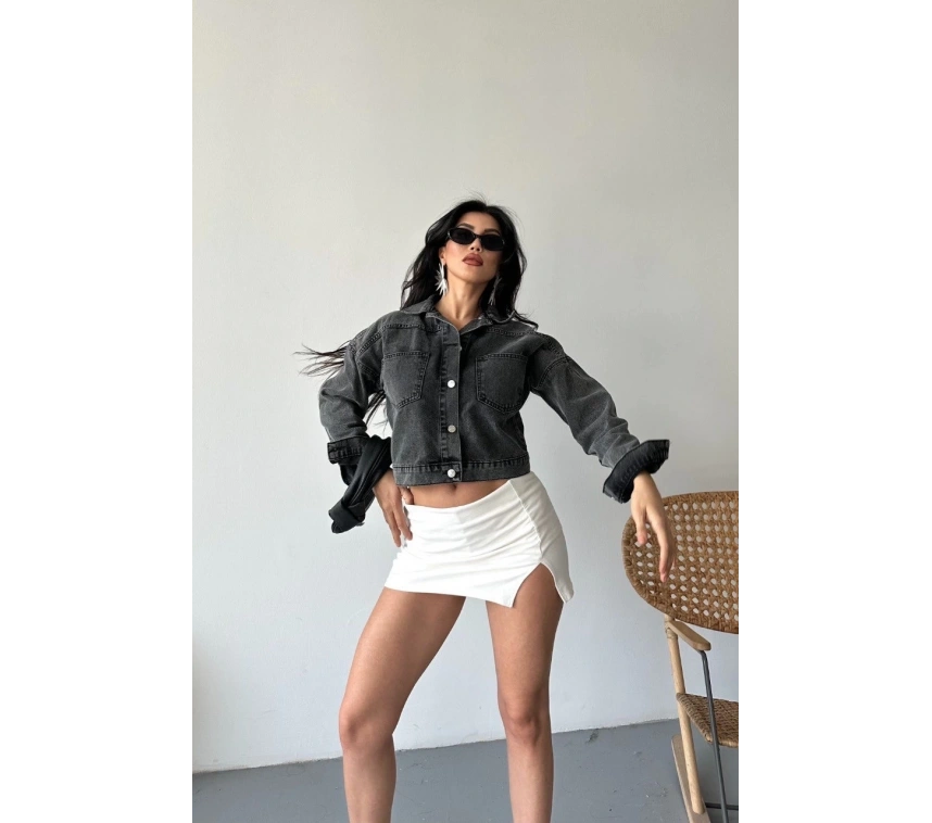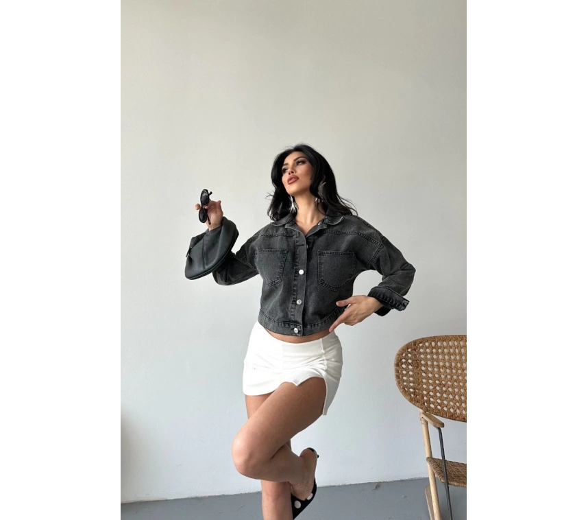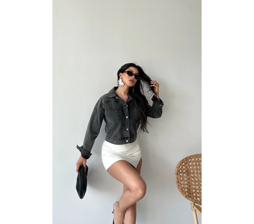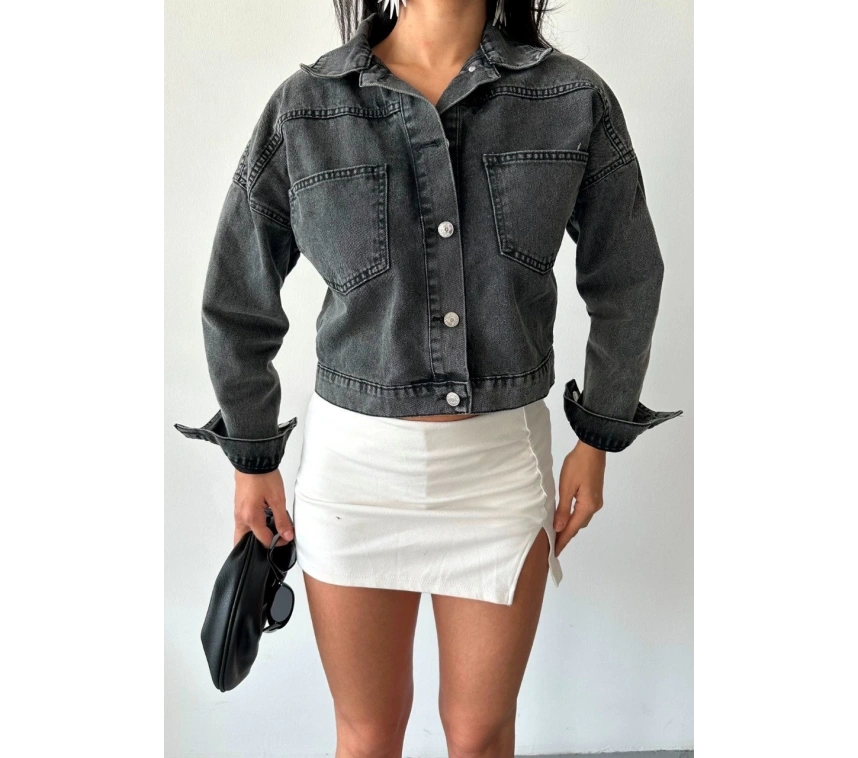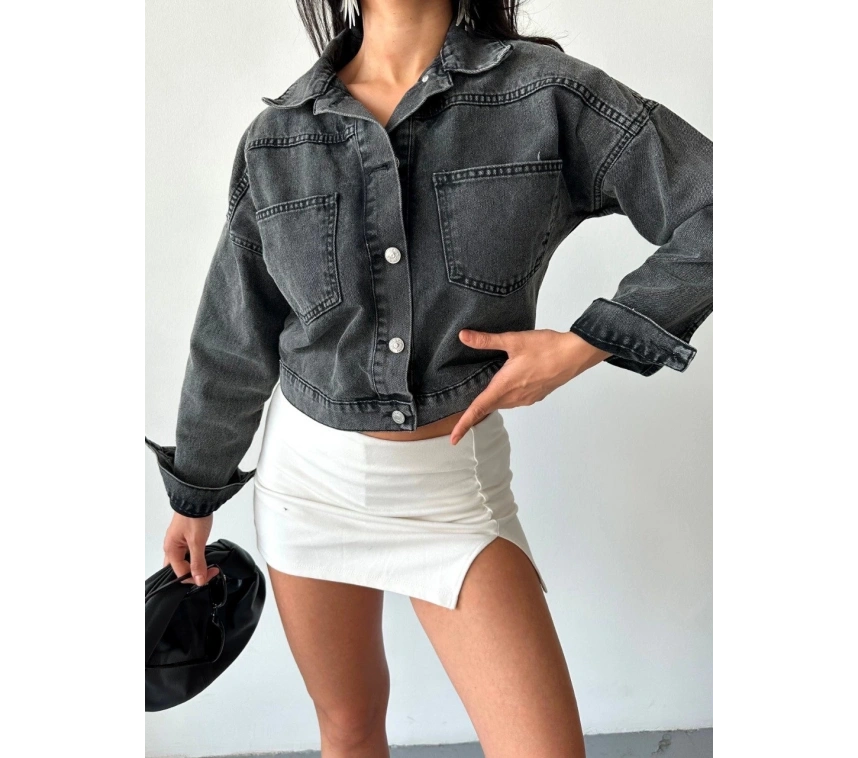Yeni sezonda sokak modasına yön veren çift cepli kol katlamalı süper taş enzim yıkama crop kot ceket ile tarzınızı ön plana çıkarın.