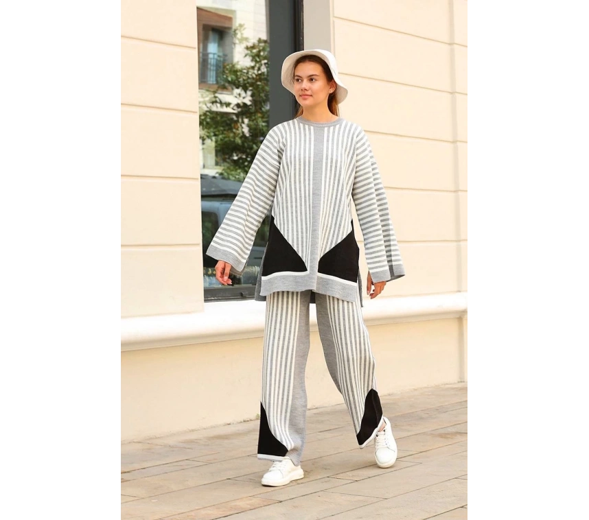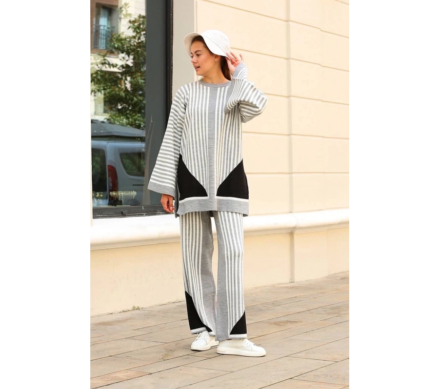 Bu çizgili bisiklet yaka triko takım Gri rengi ile şıklığı ve rahatlığı bir arada sunuyor.