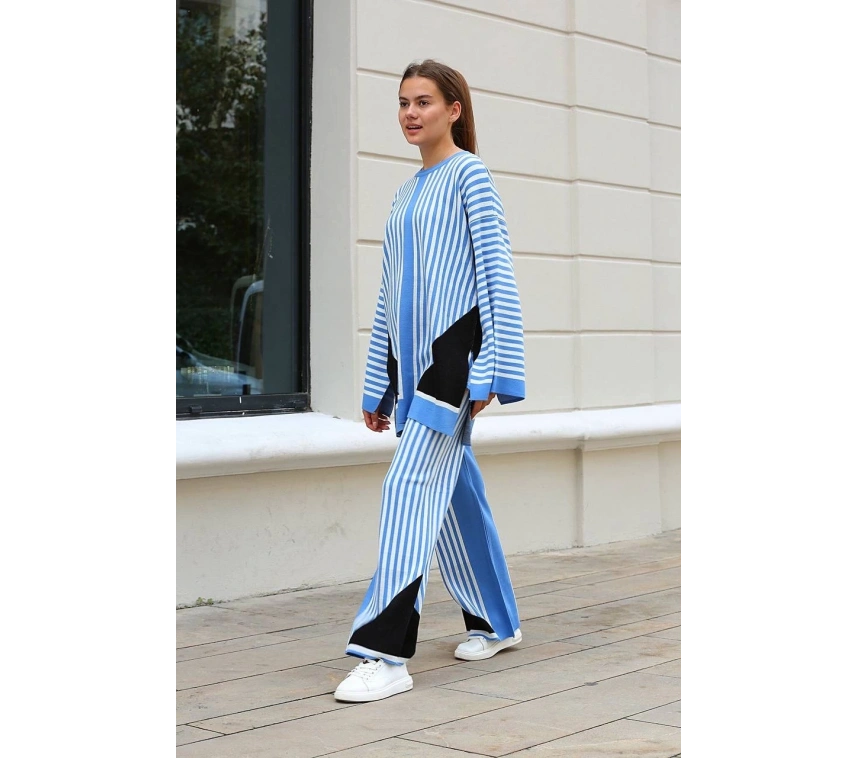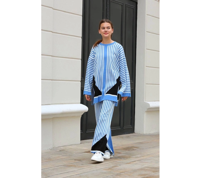 Çizgili bisiklet yaka triko takım Mavi, şıklığı ve konforu bir araya getiren kadınlar için ideal bir seçimdir.