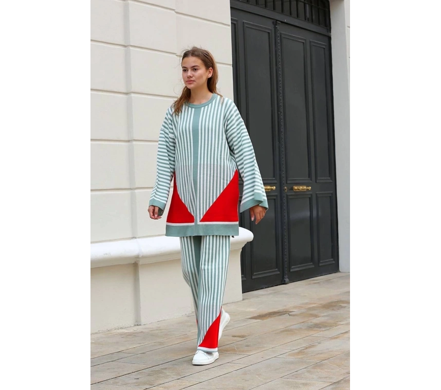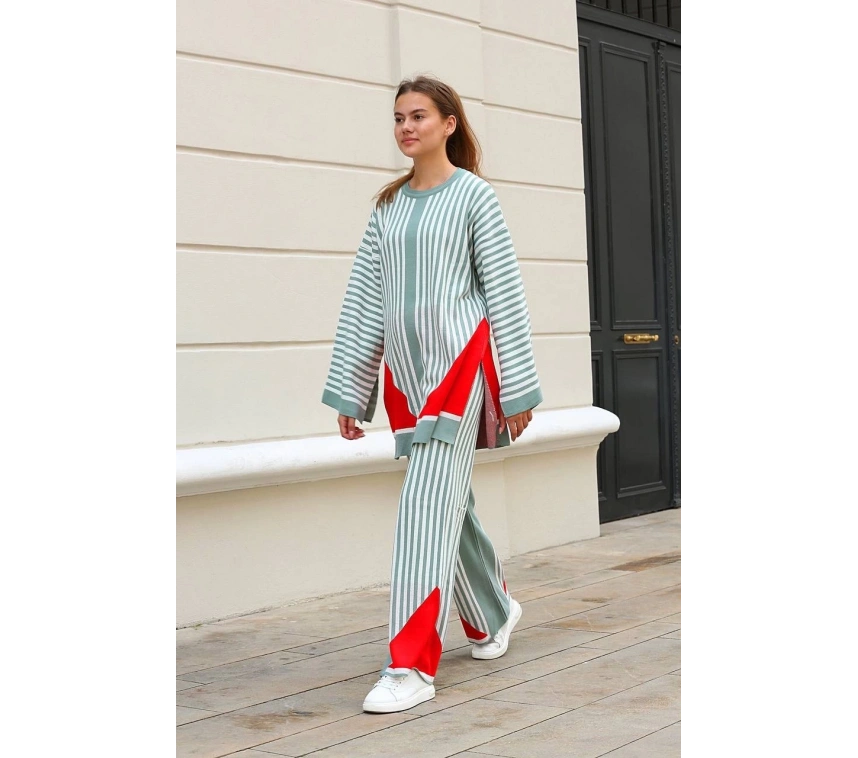 Çizgili Bisiklet Yaka Triko Takım Mint, günlük hayatta, işte ya da özel davetlerde şık ve rahat bir seçenek arayan kadınların favorisi olmaya aday!