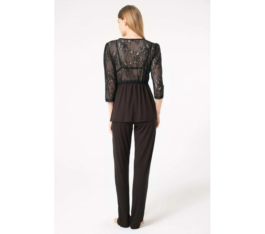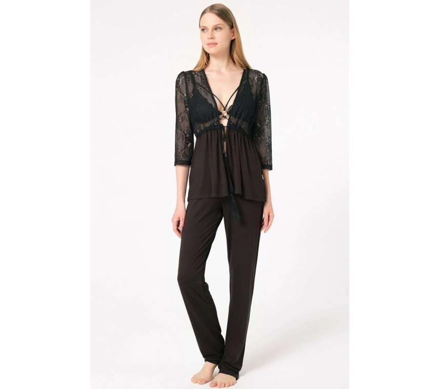 Kısa Ad:Kadın Dantelli Sabahlık Balensiz Desteksiz Dolgusuz Yaka Detaylı Sütyen ve Pantolon Pijama 3'lü Takım (5698)