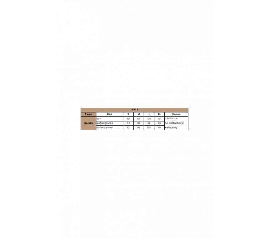 Gecelik: Siyah renklidir, derin V Yakalıdır, göğüs ve sırt dekoltelidir, ayalanabilir ip askılıdır, yakası ve göğüs kenarları ile sırtı dantellidir, yırtmaçlıdır, örme kumaştır.