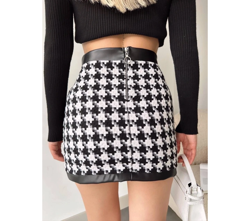 Deri garnili kaz ayağı desenli siyah eteğimiz, şıklığı ve rahatlığı bir arada sunar. Yüksek bel tasarımı ile vücudu saran kesimi, her bedene uyum sağlar. Günlük kullanıma uygun olan bu etek, farklı kombinasyonlarla hem spor hem de klasik tarzlarda kullanılabilir.