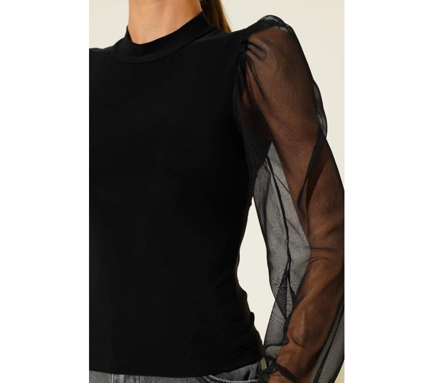 Şıklık ve zarafeti bir arada sunan siyah T3066 dik yaka tül kollu bluz, gardırobunuzun vazgeçilmezi olmaya aday.