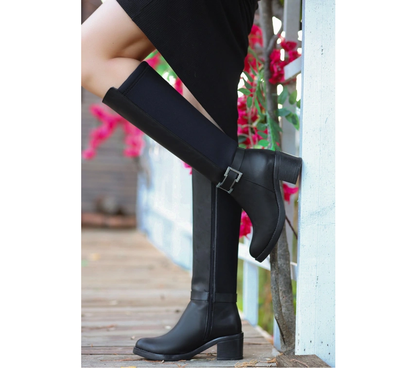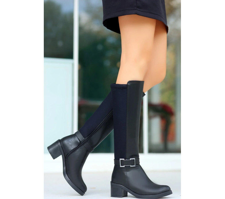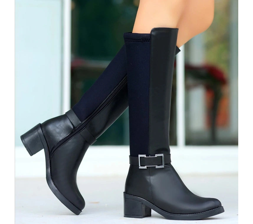Detay: Topuklu Yandan Fermuarlı Arka Kısmı Streç Diz Altı Çizme