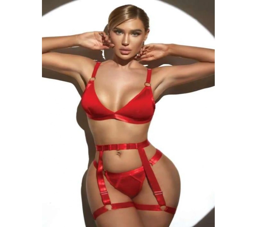 Kırmızı Bacak Aksesuarlı Fantezi Jartiyer Takım