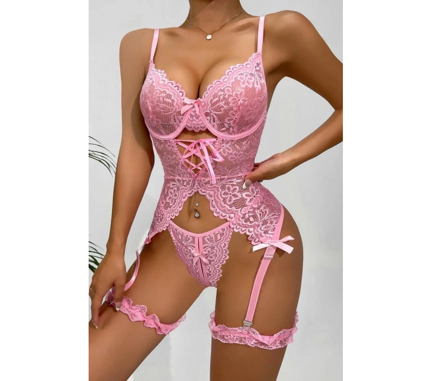 Özel Tasarım Dantelli Fantezi Pembe Jartiyer Takımı