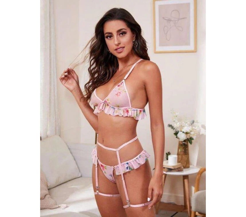 Pembe Çiçek Desen Fırfırlı Fantezi Jartiyer Takım