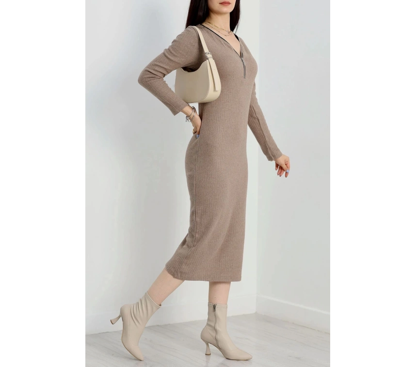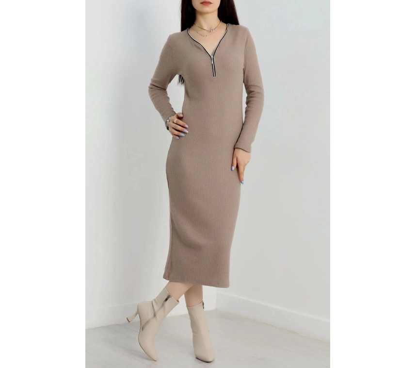 Şıklığı ve rahatlığı bir arada sunan bej renkli şardon kumaştan üretilmiş Fermuar Detaylı Fitilli Elbise, gardırobunuzun vazgeçilmezi olmaya aday.