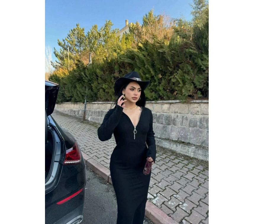 Bu şık elbise, vücudu saran fitilli kesimiyle modern bir görünüm sunarken, fermuar detayıyla da fark yaratıyor.