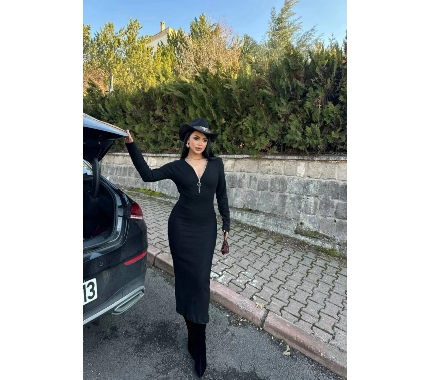 Şıklık ve zarafeti bir arada sunan Fermuar Detaylı Fitilli Şardonlu Elbise siyah rengiyle şıklığınızı tamamlıyor.