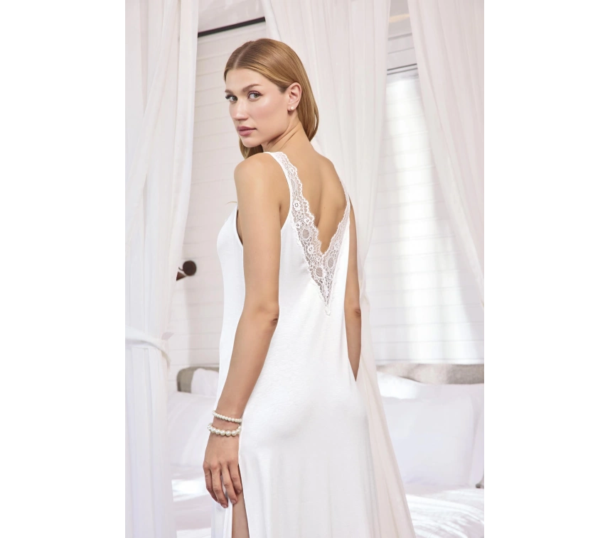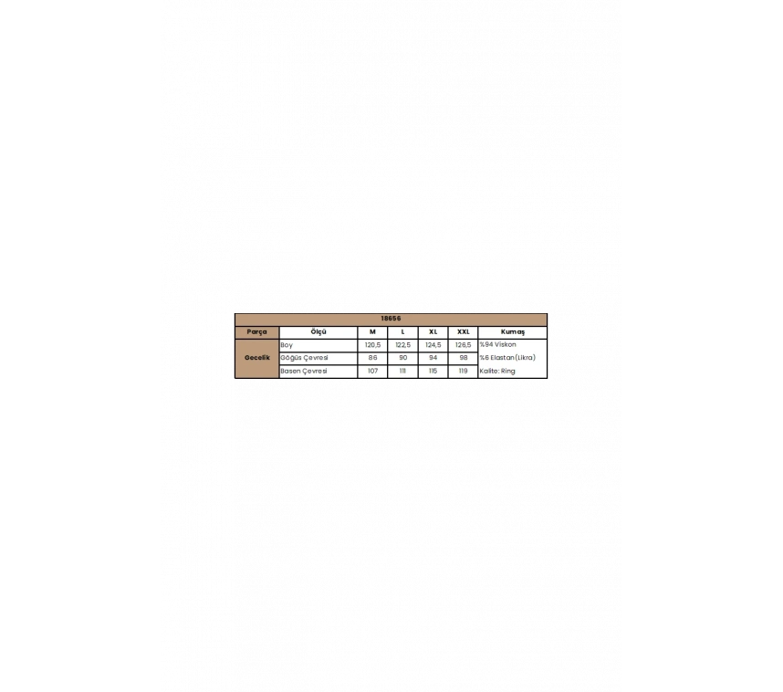 Gecelik: Beyaz renklidir, derin V Yakalıdır, sırt ve göğüs dekoltelidir, kalın askılıdır, yakası,askı kenarları ve sırtı dantellidir, yırtmaçlıdır, örme kumaştır.