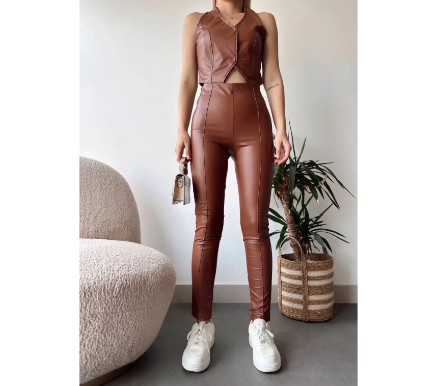 Şık ve modern tasarımıyla dikkat çeken Kahve rengi İki Düğmeli Deri Yelek, gardırobunuzun vazgeçilmezi olmaya aday!