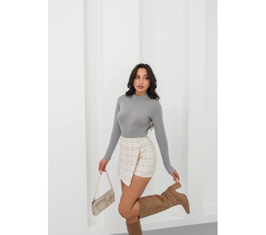 Kaz ayağı desenli Ch kumaştan üretilen şort etek, şıklığı ve rahatlığı bir arada sunar.