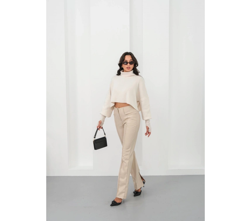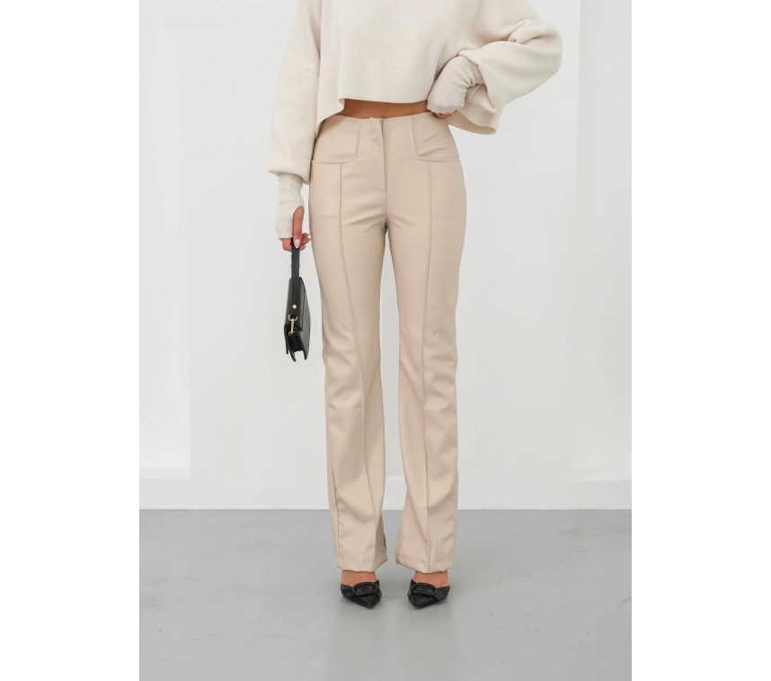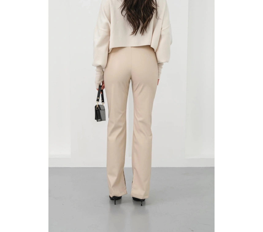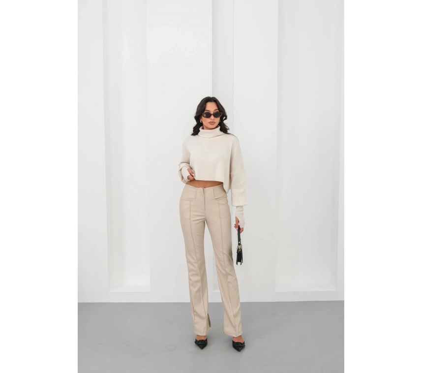 İspanyol yırtmaçlı paça deri pantolon, şıklığı ve rahatlığı bir arada sunar.