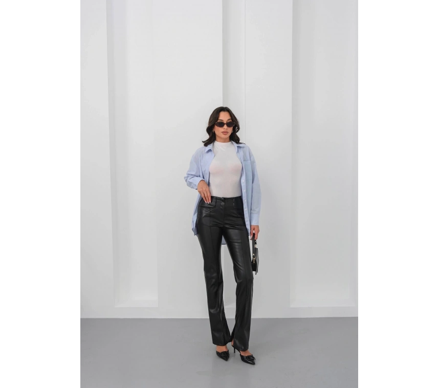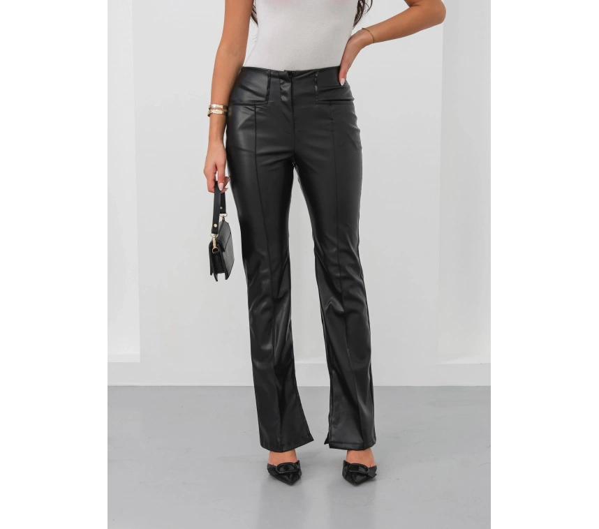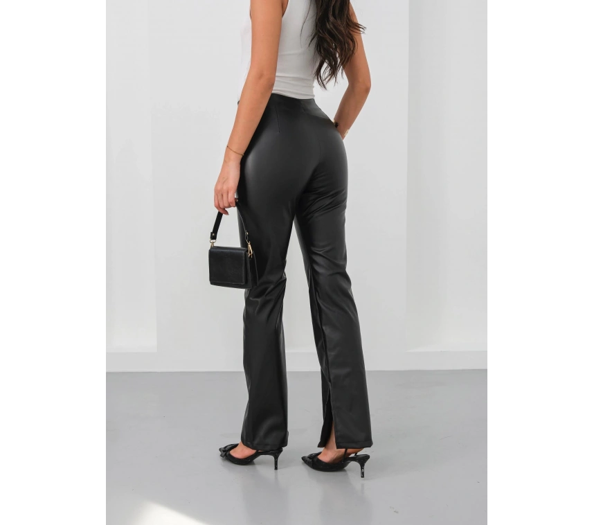 İspanyol yırtmaçlı paça deri pantolon siyah hn, hem günlük hayatta hem de özel günlerde şıklığınızı tamamlamak için ideal bir seçimdir. Sizin de gardırobunuzda mutlaka bulunması gereken bir parça!