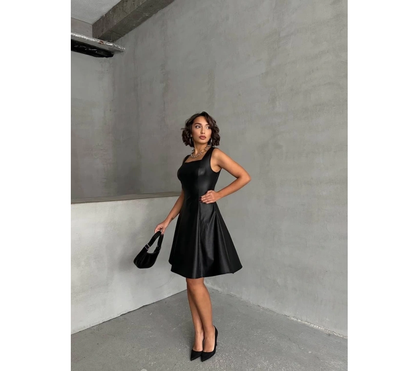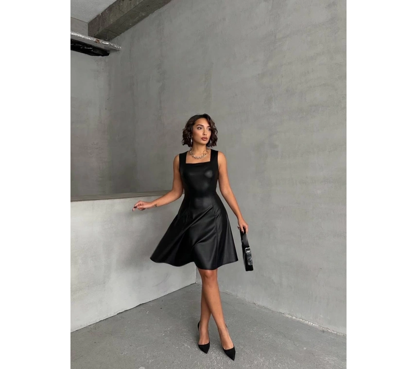 Şıklık ve zarafetin buluştuğu Kare Yaka Deri Elbise Siyah H24442, gardırobunuzun vazgeçilmezi olmaya aday!