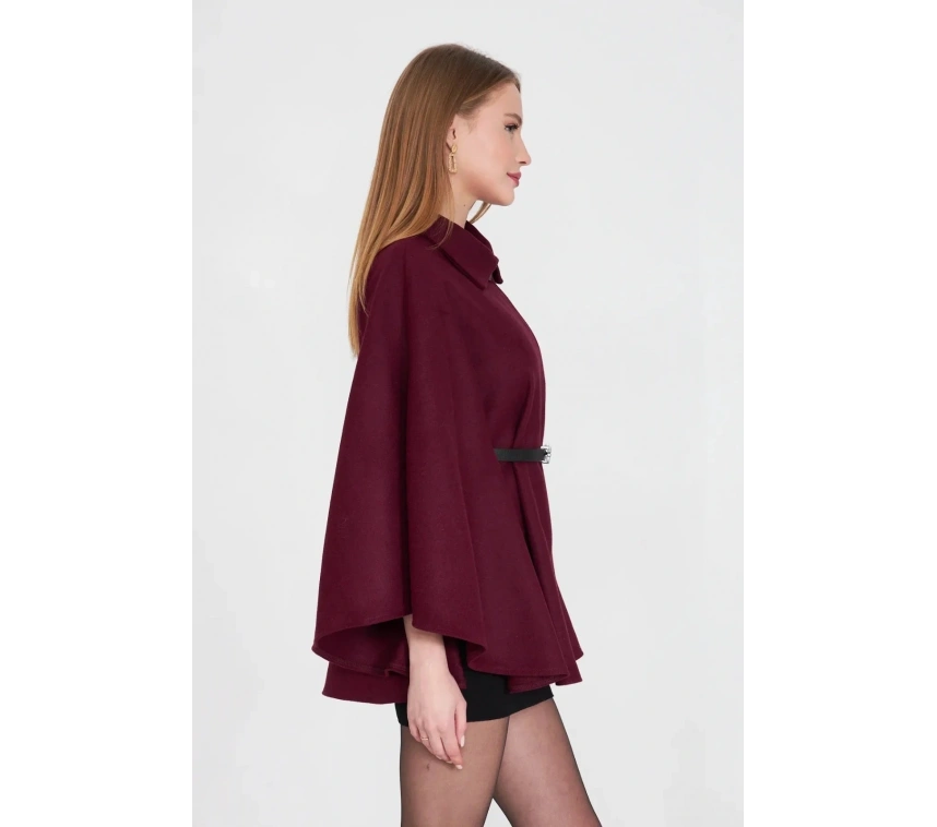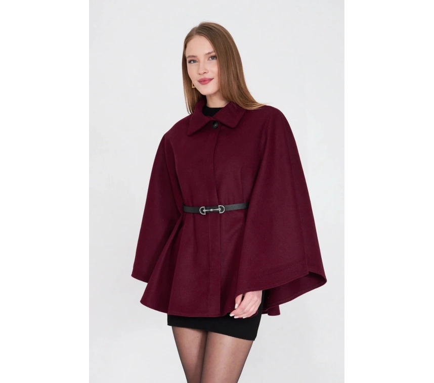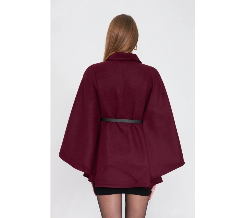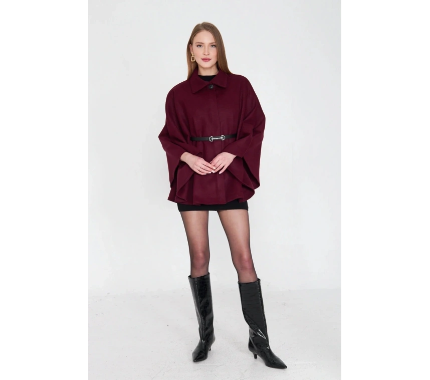 Bu kışın vazgeçilmezi olmaya aday kemerli kaşe panço bordo, şıklığınızı tamamlayacak bir parça.