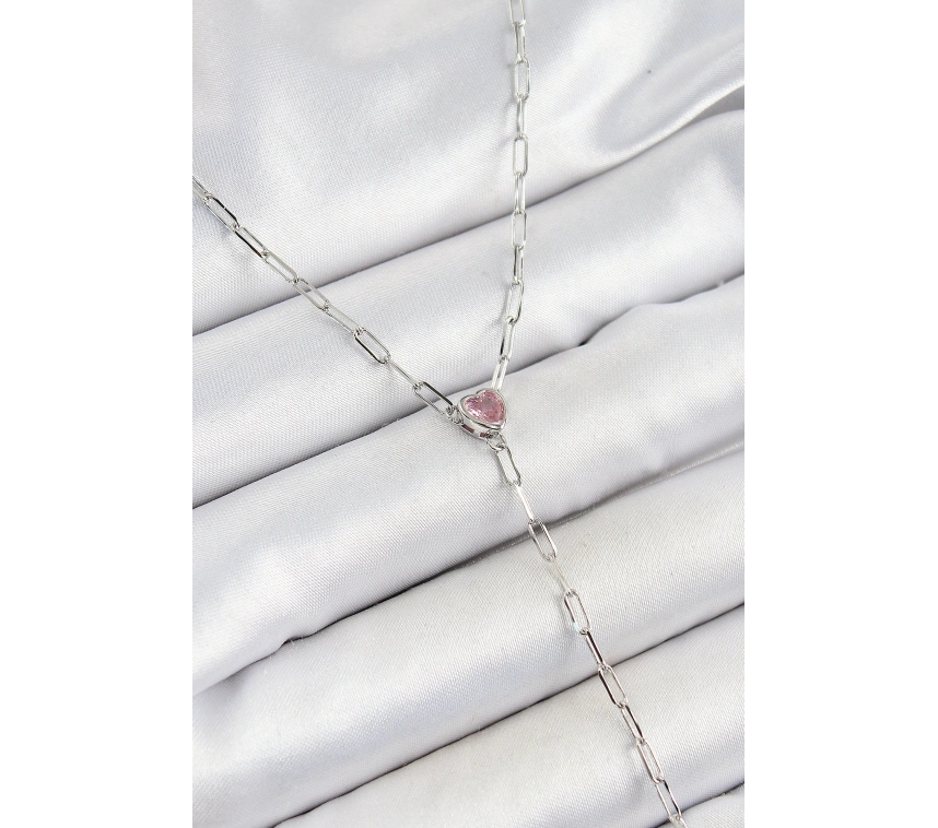 Pirinç Zirkon Taşlı Pembe Kalp Figürlü Y Model Gümüş Renk Kadın Kolye