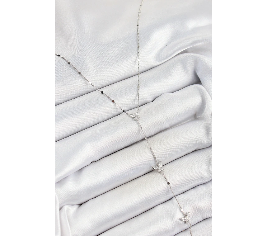 Pirinç Zirkon Taşlı Sıralı Kelebek Figürlü Y Model Gümüş Renk Kadın Kolye