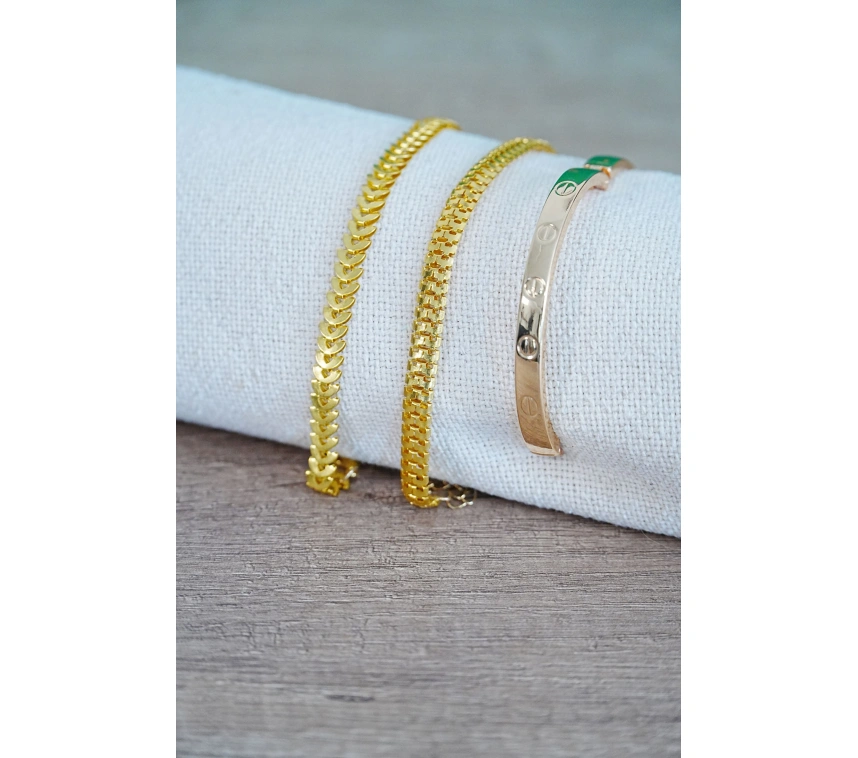 Tarzınıza ışıltı katacak modern ve zarif bir bileklik arıyorsanız, Gold Renk Kararmaz Kombin Bilekliktam size göre! Kılçık, tırtıl ve düz cırt model bilekliklerin şık uyumuyla hazırlanan bu kombin, her stile kolayca uyum sağlar.