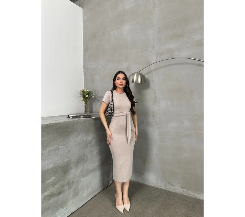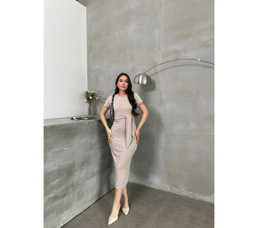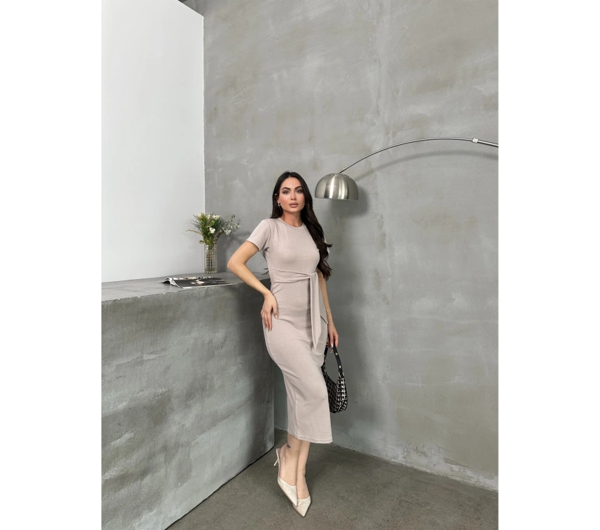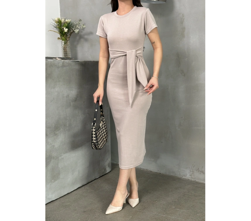 Şıklık ve konforun bir arada olduğu bu bej Kuşaklı Model Esnek Kumaşlı Elbise ile tarzınızı yansıtabilirsiniz.