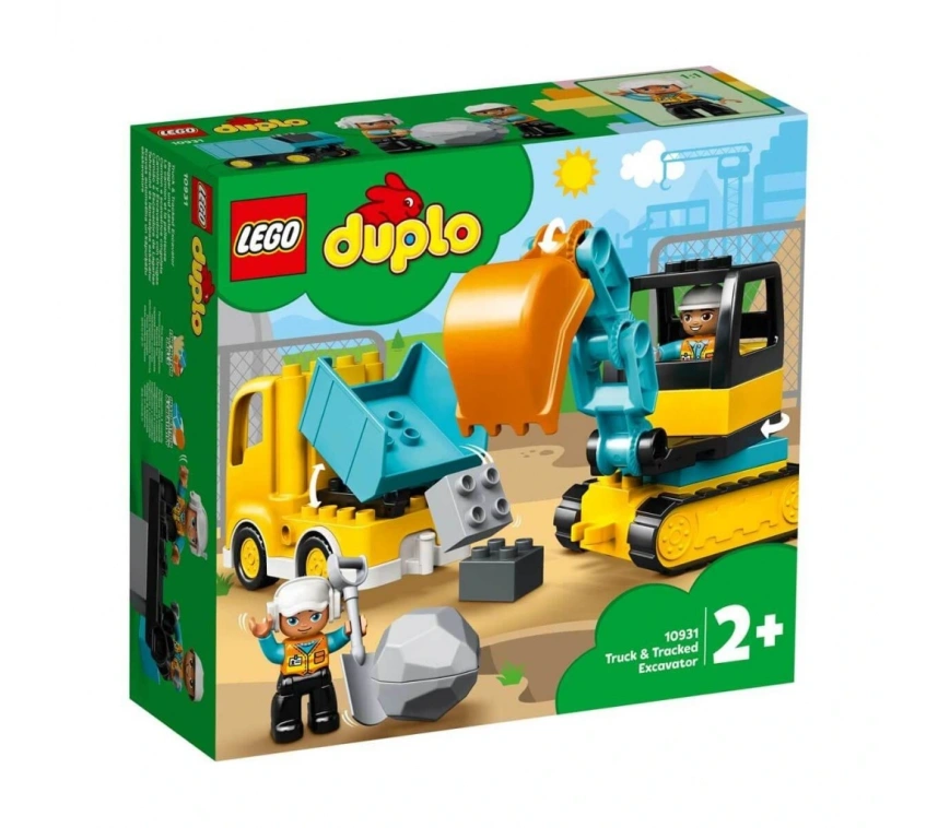 • 2 modern inşaat işçisi figürü, ittirilerek sürülen damperli bir kamyon, dönen kazıcılı ittirilerek sürülen bir ekskavatör ve çocukların açabileceği oyuncak bir kaya içerir.