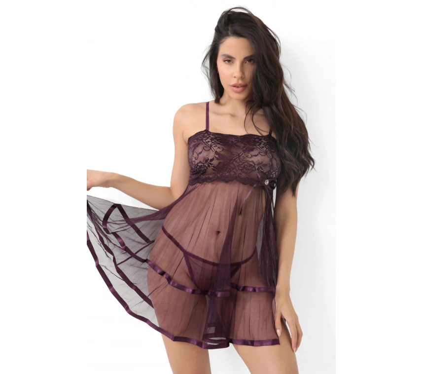 Sistina-835 Mor Şifon Pileli Dantelli Gecelik