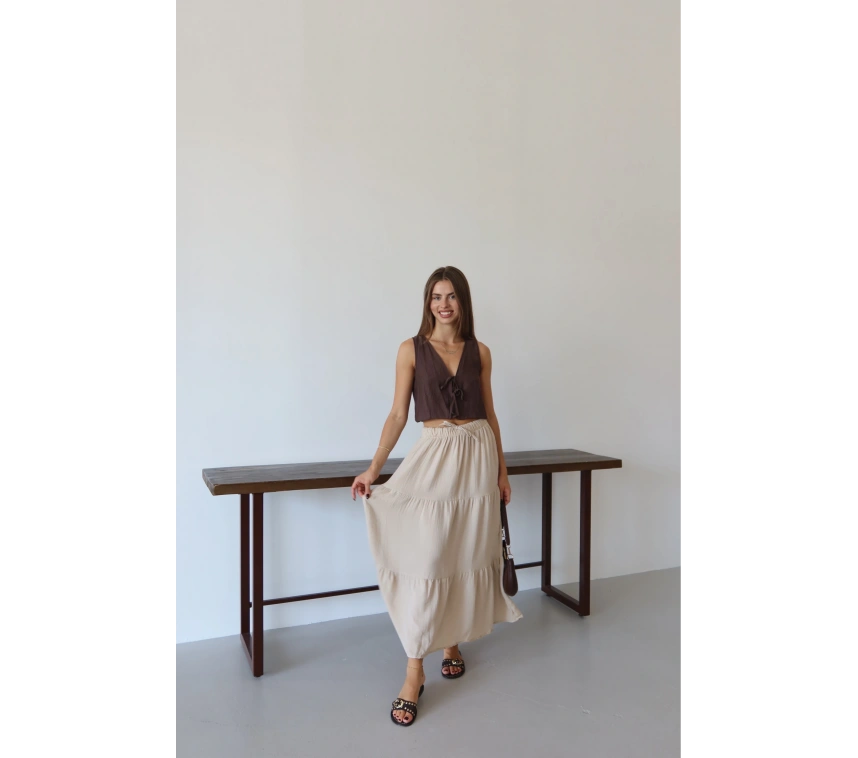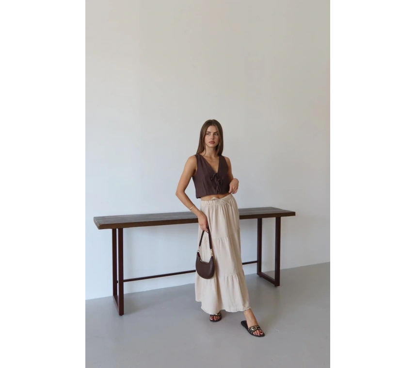 Yumuşak dokulu müslin kumaş ile tasarlanmış olan bu şık uzun etek, gardırobunuzun favori parçalarından biri olmaya aday. Hem şıklığı hem de rahatlığı bir arada sunan bej rengi, her tarza kolaylıkla uyum sağlar. Keten kumaşın sağladığı hafiflik ve doğal görünüm, yaz aylarında tercih edebileceğiniz ideal bir parça haline getiriyor.