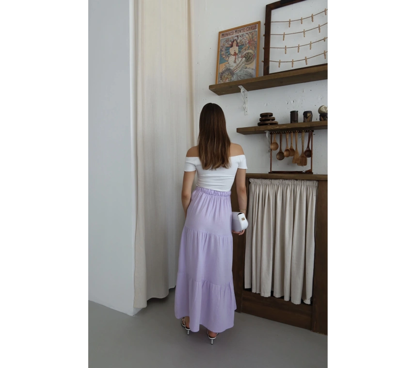Sezonun trend parçası olan bu uzun etek, şıklığı ve rahatlığı bir arada sunuyor. Yüksek kaliteli müslin kumaştan üretilmiş olan etek, gün boyu konfor sağlar. Zarif lila rengi ile her mevsim ve her kombinle uyum sağlar.