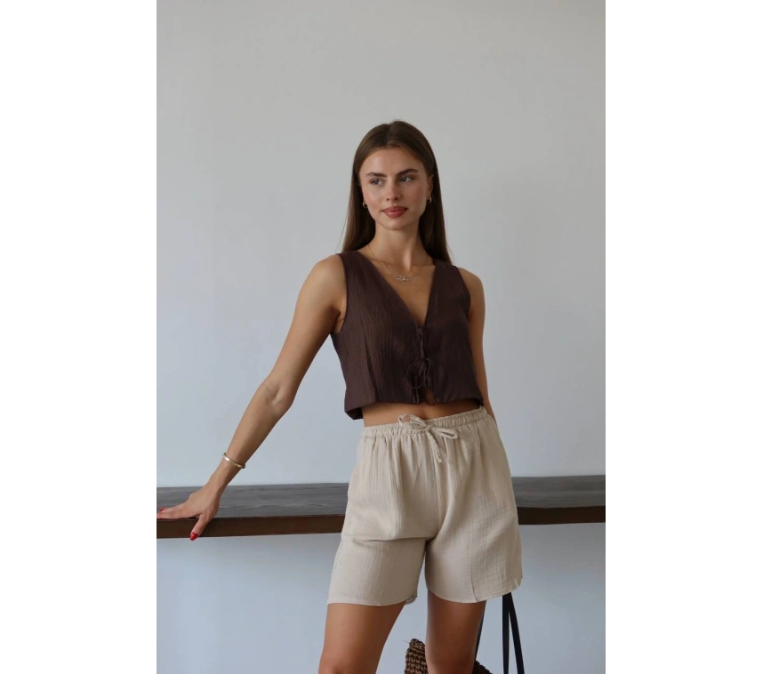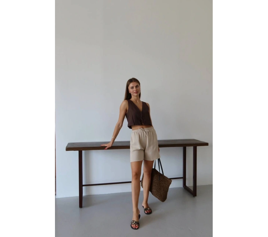 Bu bağcıklı bej şort, hem şık hem de rahat bir seçenektir. Müslin kumaştan üretilmiş olan bu şort, yaz aylarında vazgeçilmeziniz olmaya aday. İster günlük kombinlerinizde ister plajda şık bir alternatif arıyorsanız, bu şort tam size göre!