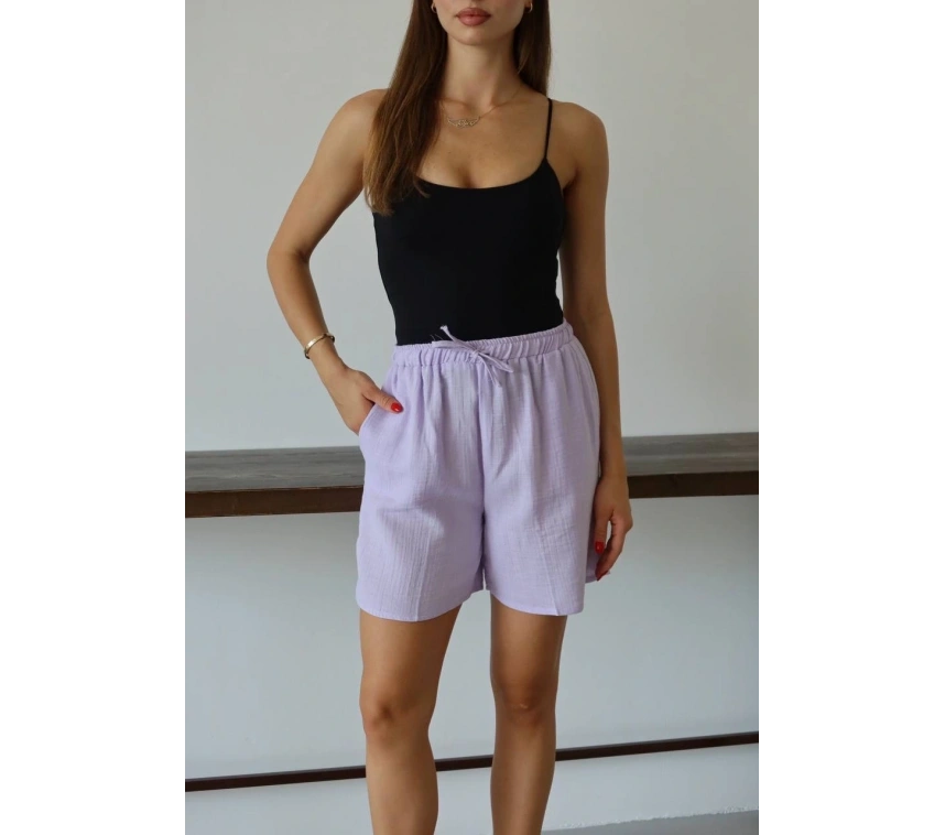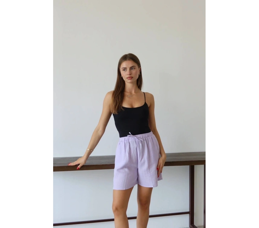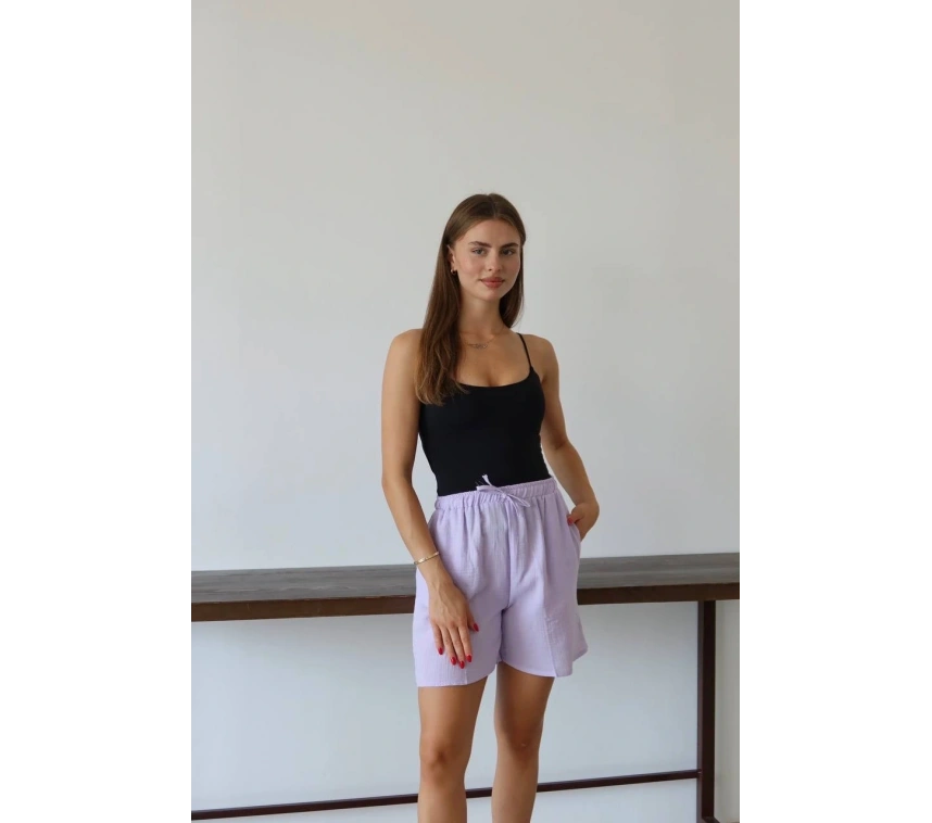 Müslin Kumaş Şort Bağcıklı Lila PT, gardırobunuzun vazgeçilmez parçası olmaya aday! Rahatlığı ve şıklığı bir arada sunan bu şort ile şıklığı yakalayacaksınız.