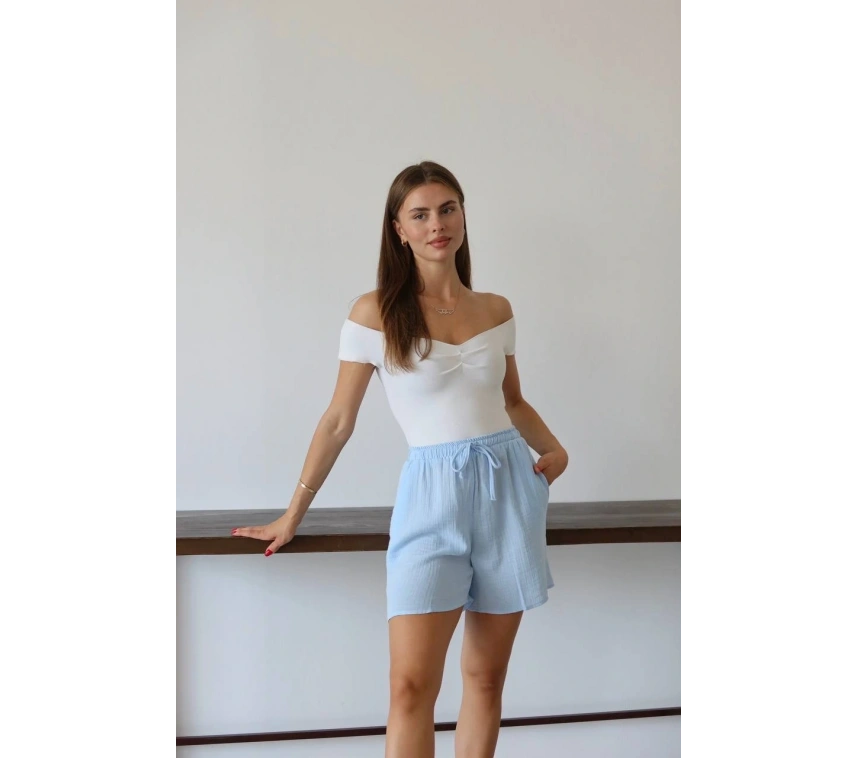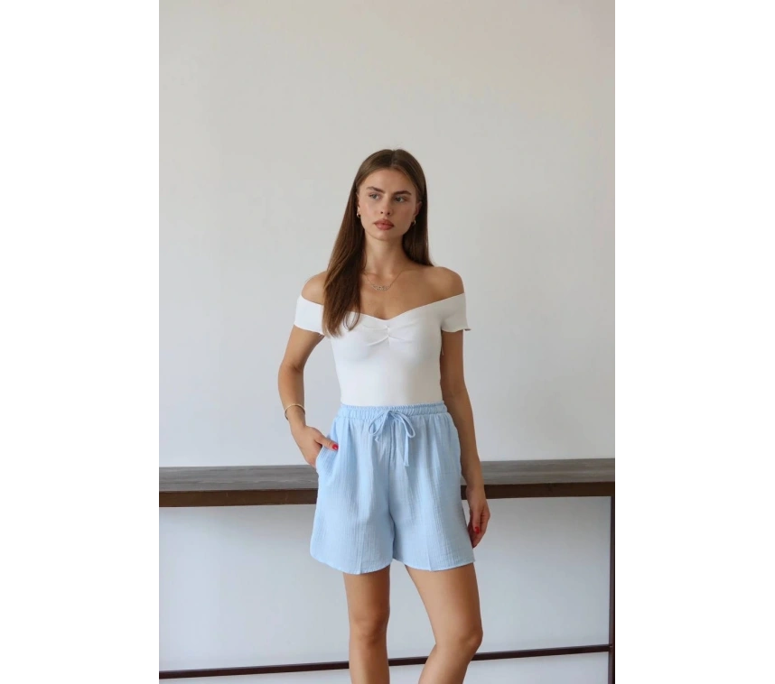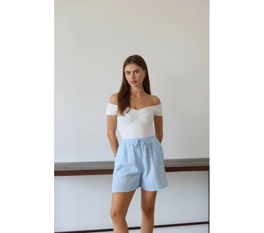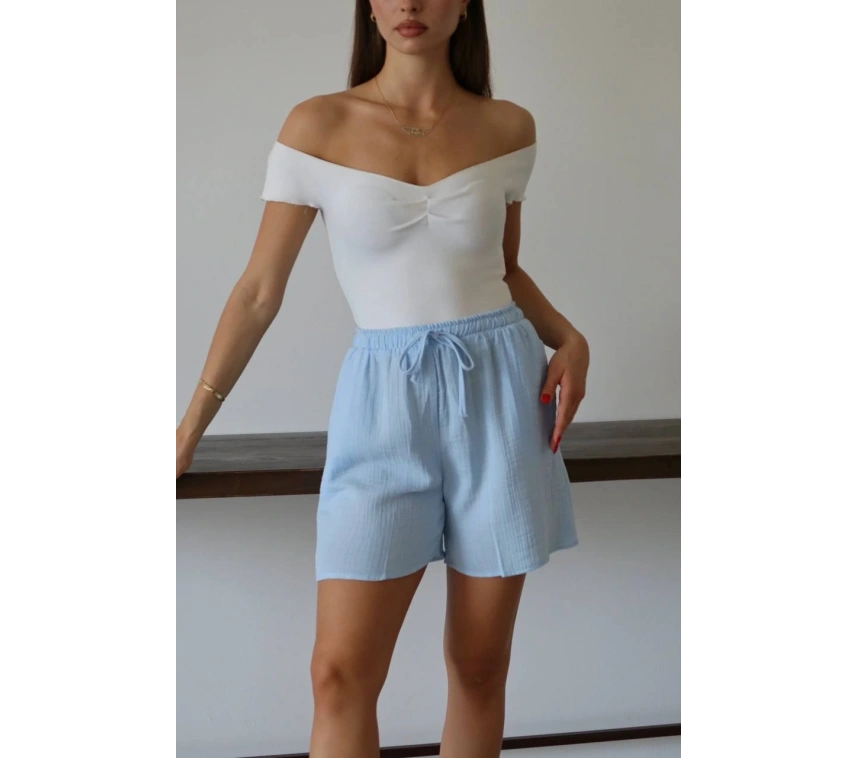 Bu mavi şort, yaz aylarında rahat ve şık bir seçenektir. Bağcıklı tasarımı sayesinde bel kısmını istediğiniz şekilde ayarlayabilirsiniz. Yüksek kaliteli müslin kumaştan üretilmiştir ve cilt dostudur. Hem günlük kullanıma hem de plaj günlerine uygun bir parçadır.
