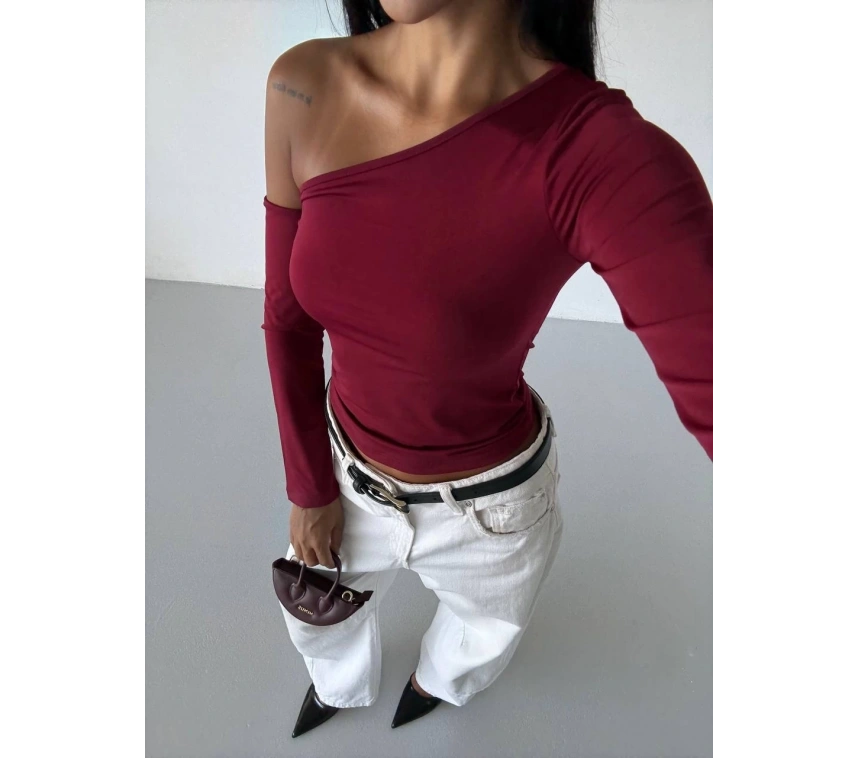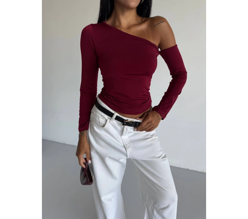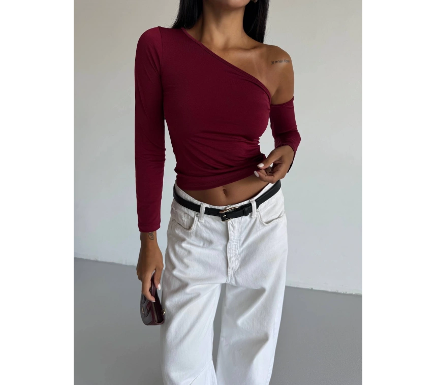 Omuz detaylı kollu bluz bordo F2336, trendy ve şık bir görünüm sunar.