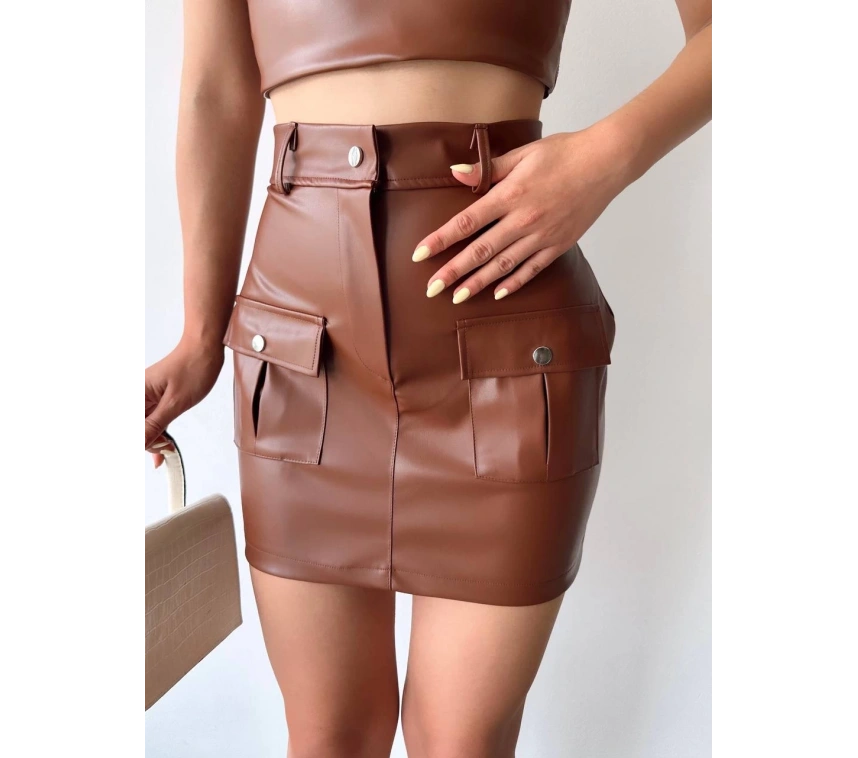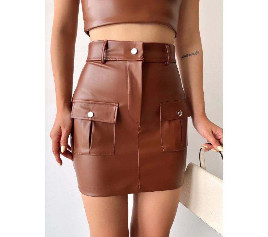 Bu özel tasarım deri etek, gardırobunuzun vazgeçilmezi olmaya aday! Şık ve şık bir görünüm sağlayan öndeki iki cepli detayı ile dikkat çekiyor.