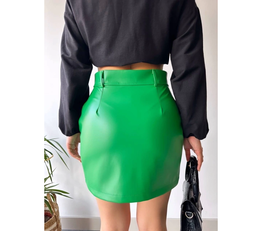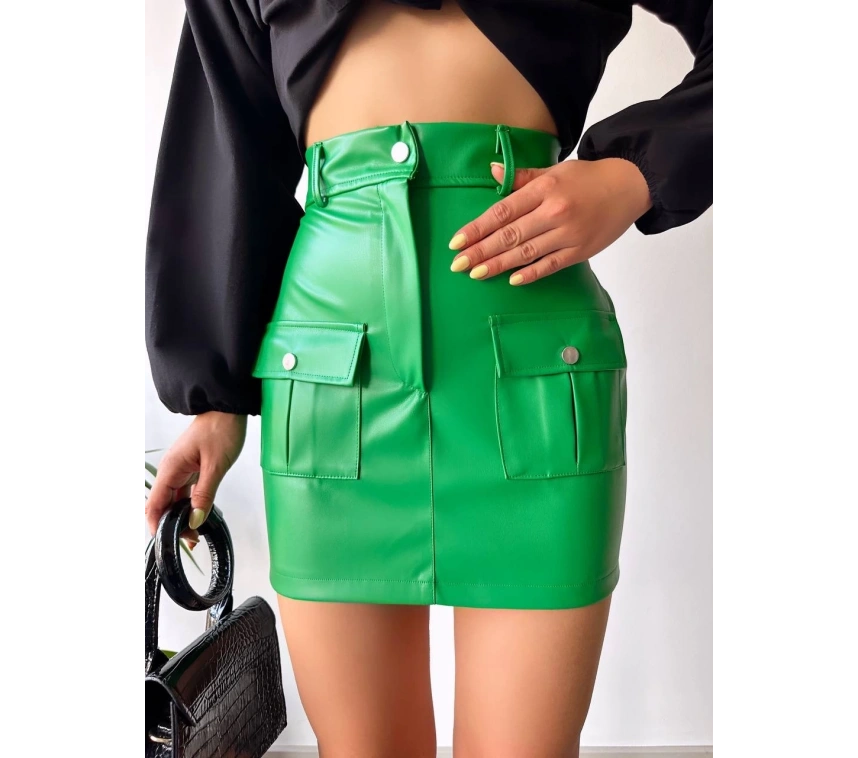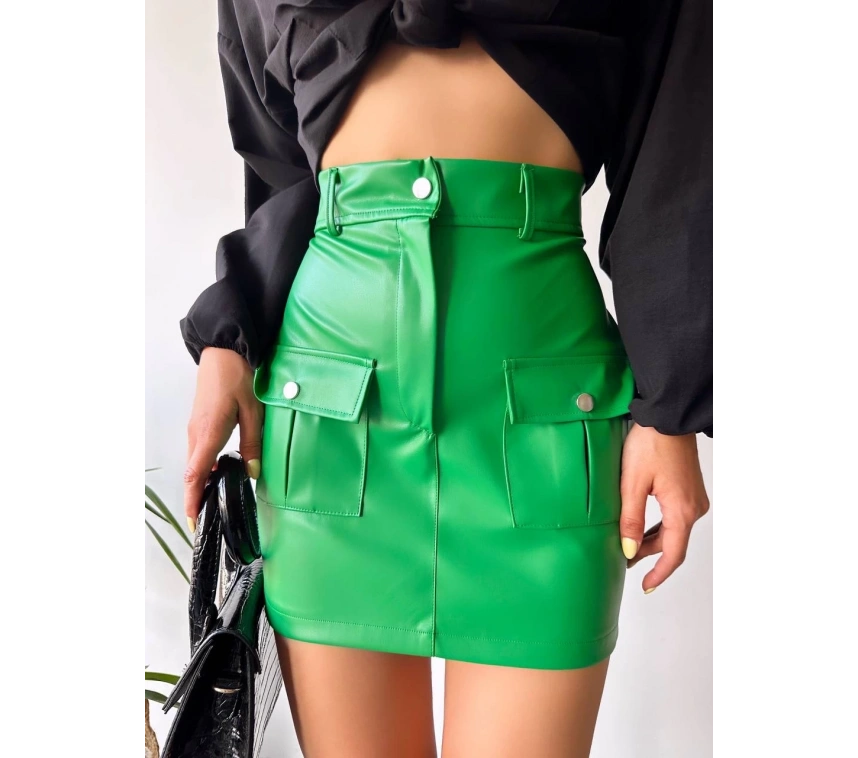 Önden iki cepli deri etek, gardırobunuzun vazgeçilmezi olmaya aday!