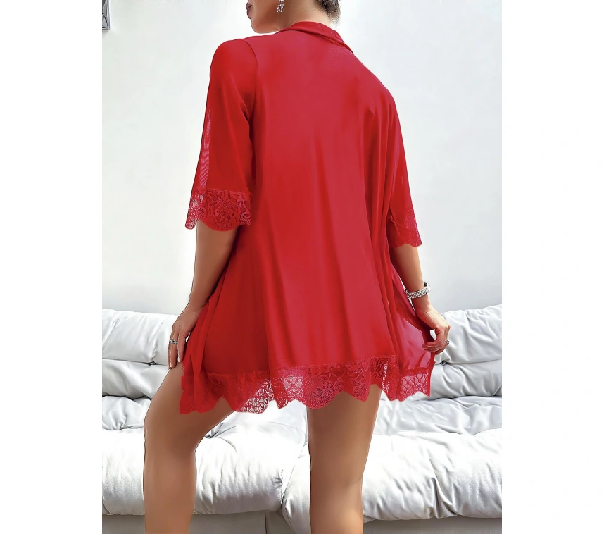Özel Tasarım Dantel İşlemeli Göğüs Dekolteli Sabahlıklı Kırmızı 2'li Tül Gecelik Takımı, romantik tül dokusu ve çarpıcı kırmızı rengiyle gecelere etkileyici bir şıklık katar. Göğüs kısmındaki zarif dantel işlemeler ve feminen dekolte detayı, tasarıma büyüleyici bir çekicilik kazandırır.