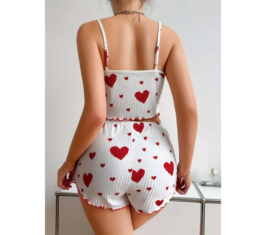 ❤️ Pamuklu Beyaz Üstüne Kırmızı Kalp Desenli Askılı Şortlu Pijama Takımı