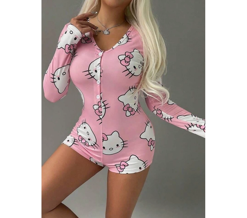 Sevimli Hello Kitty desenleri ve yumuşak pembe tonu ile ev stiline neşe katan bu tulum pijama, pamuklu dokusu sayesinde gün boyu rahatlık sunar. Uzun kollu yapısı serin havalarda sıcak tutarken, tek parça formu ile konforlu bir kullanım sağlar.