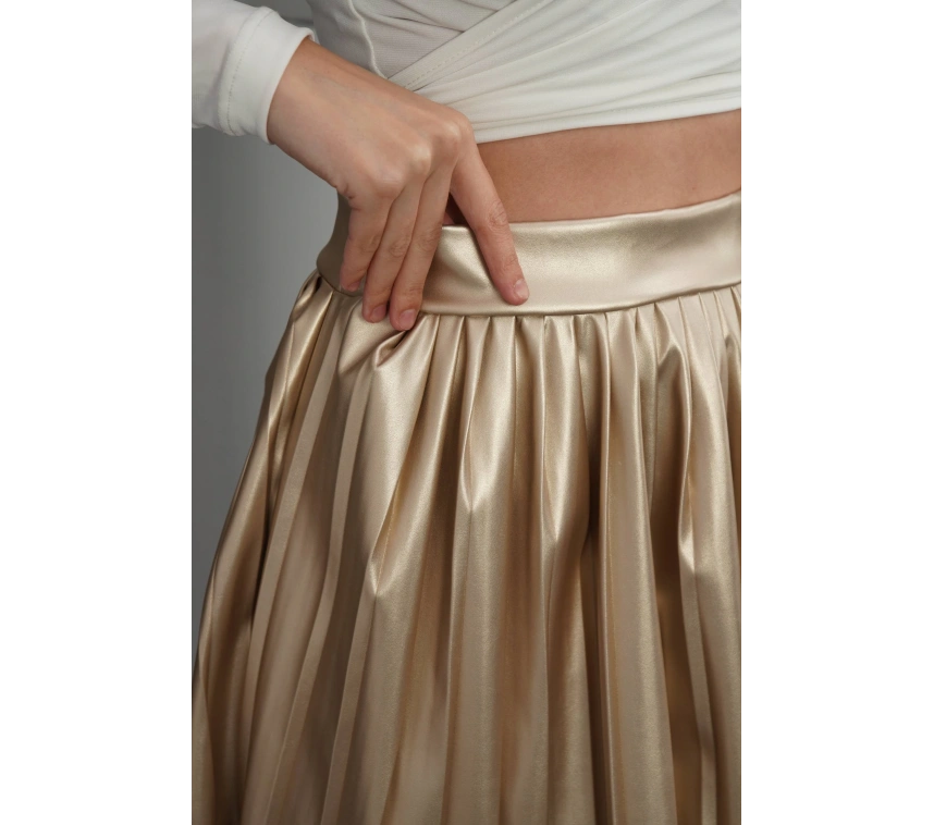 Piliseli deri etek gold h261564, şıklığı ve tarzı bir arada sunan bir parçadır.
