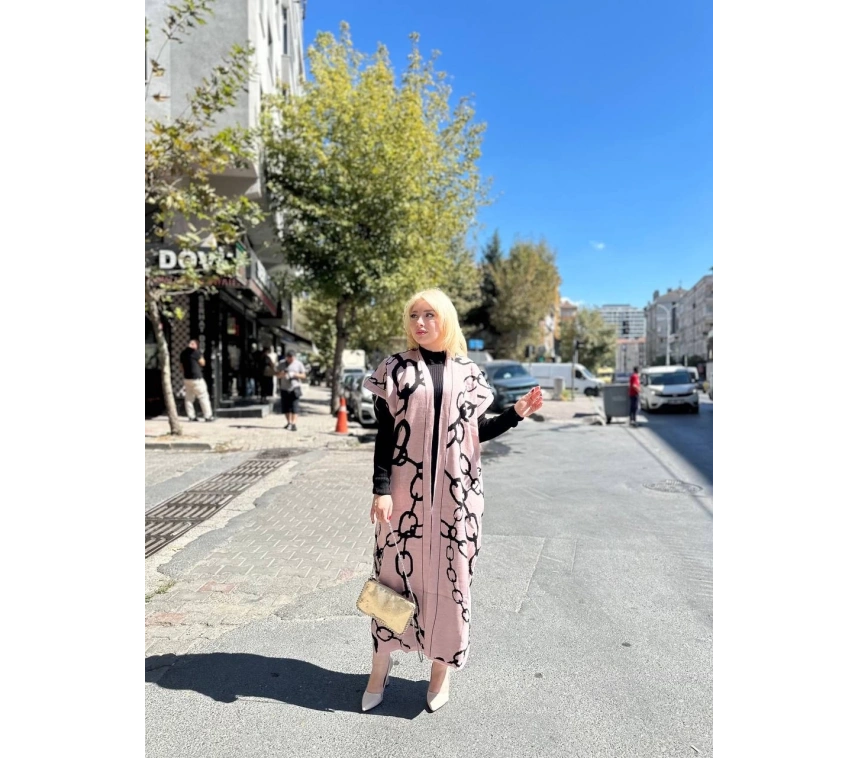 Şıklık ve rahatlığı bir arada sunan Siyah Çizgi Desenli Elbiseli Hırka Takım Pudra Siyah, gardırobunuzun vazgeçilmez parçalarından olmaya aday.